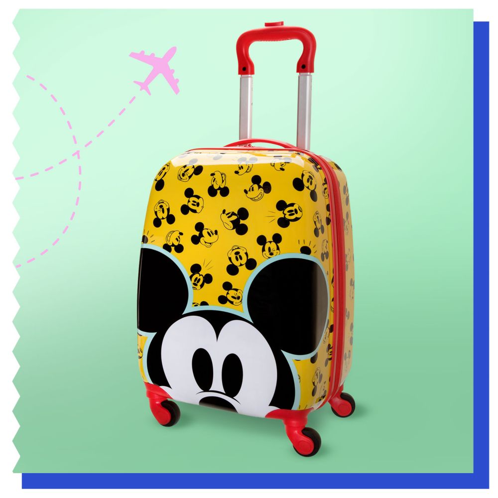 You'll earn miles of smiles carrying Mickey's rolling luggage! This sturdy hard shell suitcase is patterned with animated Mickey expressions and there is room enough inside to pack plenty of travel essentials.